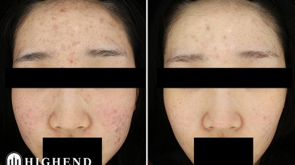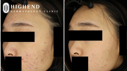 해당 환자분께서는 염증성 여드름이 난 후 붉은 자국과 색소 침착, 함몰 흉터가 복합적으로 나타났습니다.